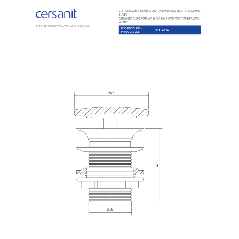 Cersanit Larga Eurowhiite ceramiczny korek do umywalek bez przelewu biały