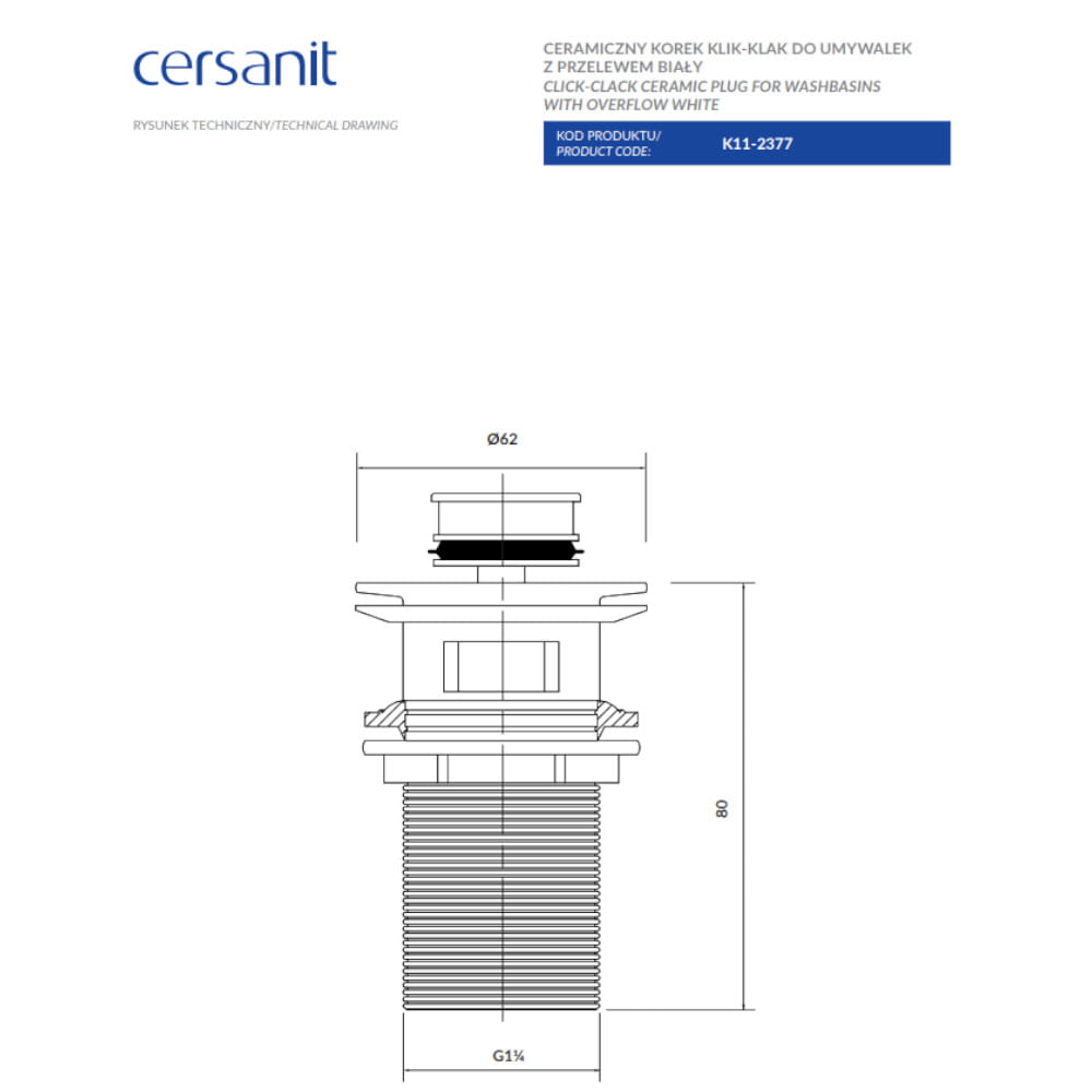 Cersanit Larga Eurowhite ceramiczny korek klik klak do umywalek z przelewem