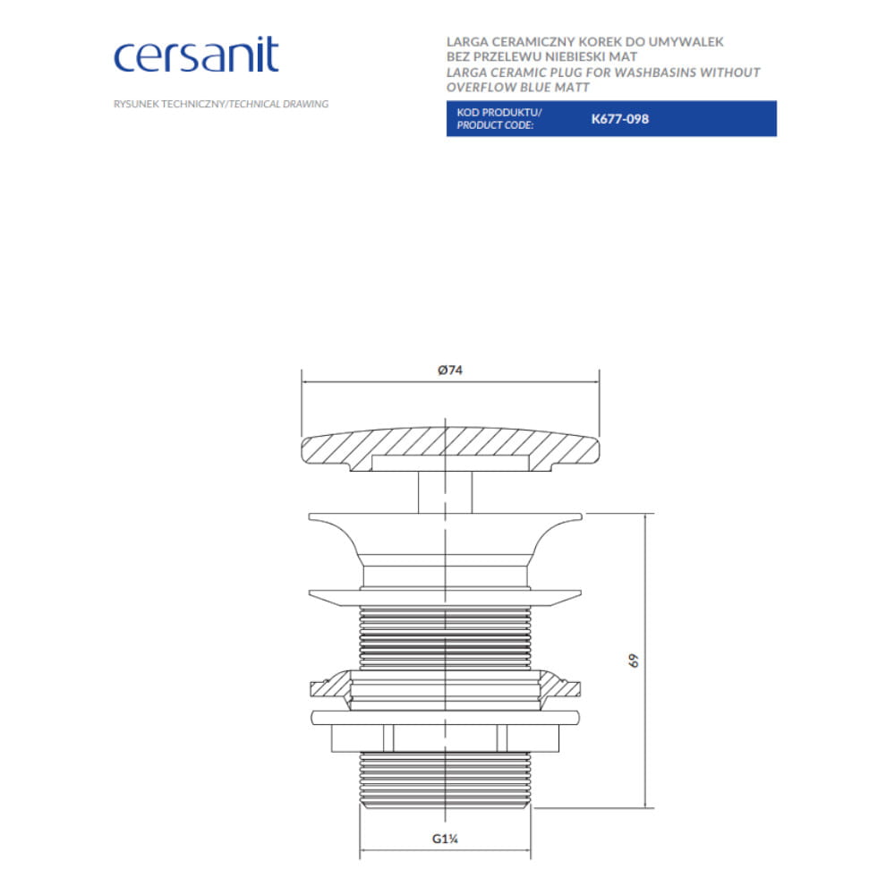 Cersanit Larga ceramiczny korek do umywalek bez przelewu niebieski mat