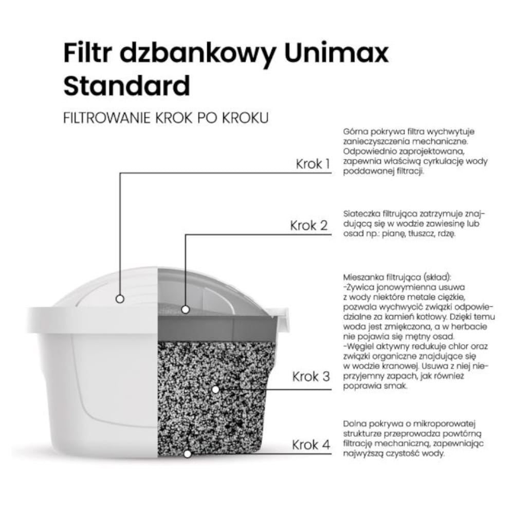 Opis: Filtr Standard Unimax zawiera odpowiednio dobraną i systematycznie kontrolowaną mieszankę filtrującą składającą się z węgla aktywnego i żywicy jonowymiennej. Dzięki temu filtr znacznie redukuje twardość wody , zawartość metali ciężkich, związków chloru oraz innych substancji mogących niekorzystnie wpływać na smak, zapach i barwę wody kranowej.