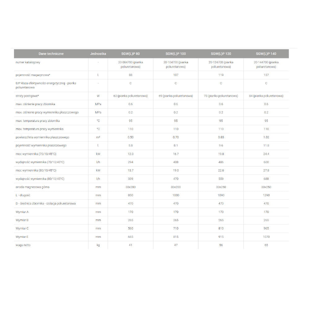 Wymiennik dwupłaszczowy SGW(L)P poziomy zapewnia szybkie ogrzanie wody użytkowej. .Posiada opatentowaną technologię izolacji. oraz najwyższej jakości emalię ceramiczną EXTRA GLASS®. O zwiększone zabezpieczenie antykorozyjne dba wymienna anoda magnezowa. W dennicy wymiennika zastosowano mufę cyrkulacyjną oraz mufę pod czujkę z kotła c.o. Współpracuje z wszystkimi typami kotłów c.o.