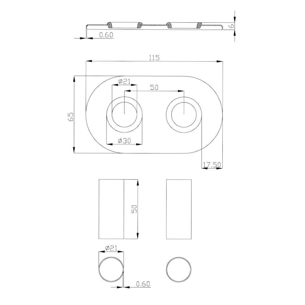 Zawartość kompletu: 1 x podwójna owalna rozeta 65 x 115 mm 2x tuleje długości 50 mm 2x o-ringi w kolorze rozet utrzymujące rozetę przy ścianie